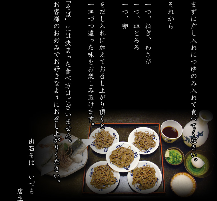 出石焼きの手塩皿に3口ほどのそばを盛り、5枚一組で一人前とするのが出石そばの特徴です
