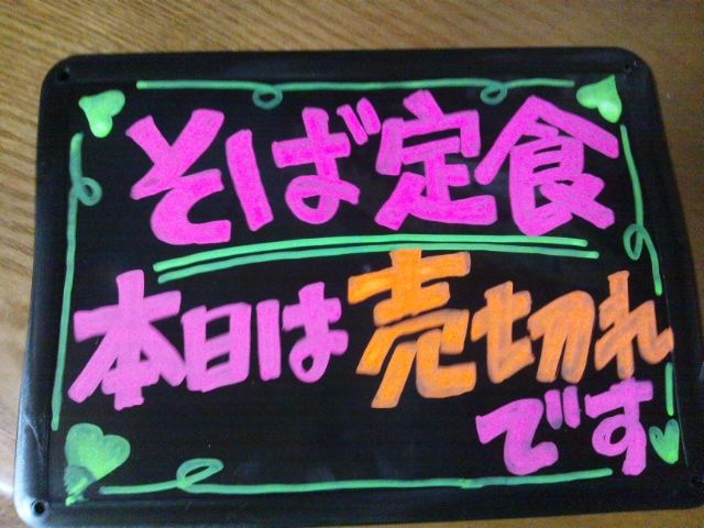 暑いですねー毎日うだるほどの暑さが続いてますが、皆さん食欲はおありでしょうか? 暑さで食欲わかんわー。と言う方は、是非、うちの皿そばを食べて下さいね。そうそう、、、「鳥おろしそば」というのがあるんです。暑いときには、鳥だしのあっさり冷たい「鳥おろしそば」めちゃ旨ですよー。 最近、、、いや、前からなんですが、そば定食が売切れてからもお客様の注文が切れませんので、売り切れプレートを作りました。 鳥おろしそば